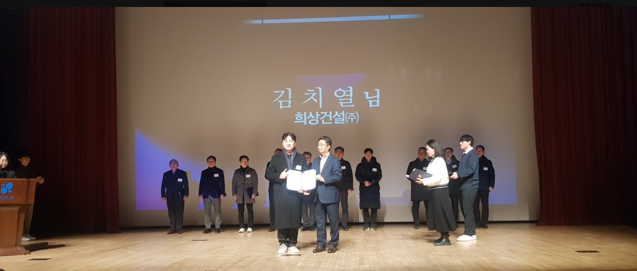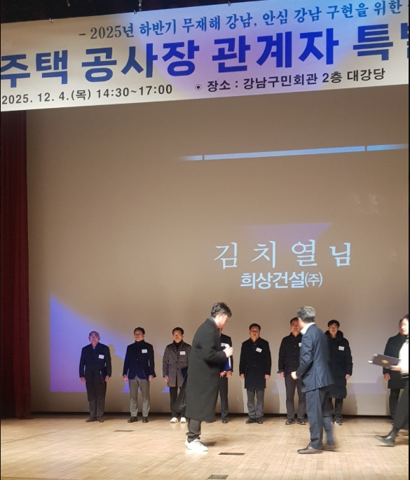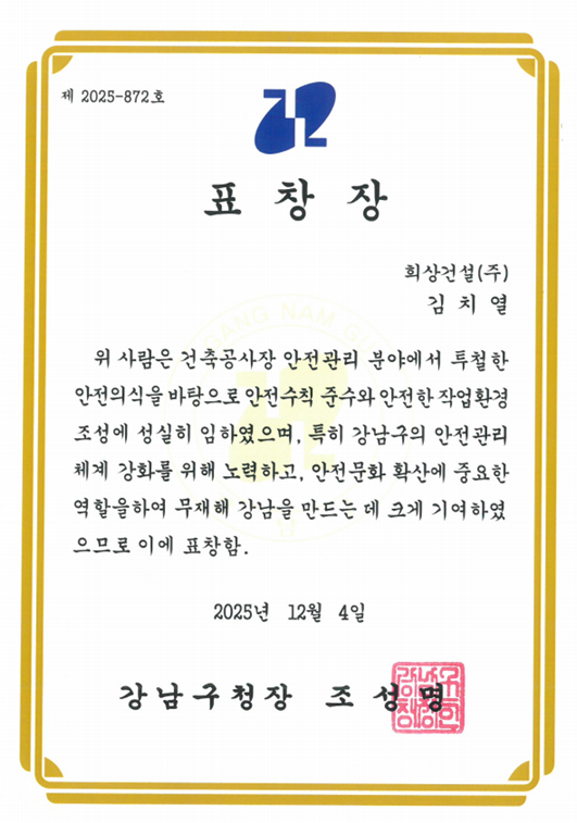 김치열소장 강남구청장 표창장 수상2025년 12월 4일 건축공사장 안전관리 분야에서 투철한 안전의식을 바탕으로 안전수칙 준수와 안전한 작업환경 조성에 성실히 임한 공로를 인정받았습니다.강남구의 안전관리 체계 강화를 위해 노력하고, 안전문화 확산에 중요한 역할을하여 무재해 강남을 만드는데 크게 기여하여 '김치열 소장' 강남구청장 표창장을 수상하였습니다
